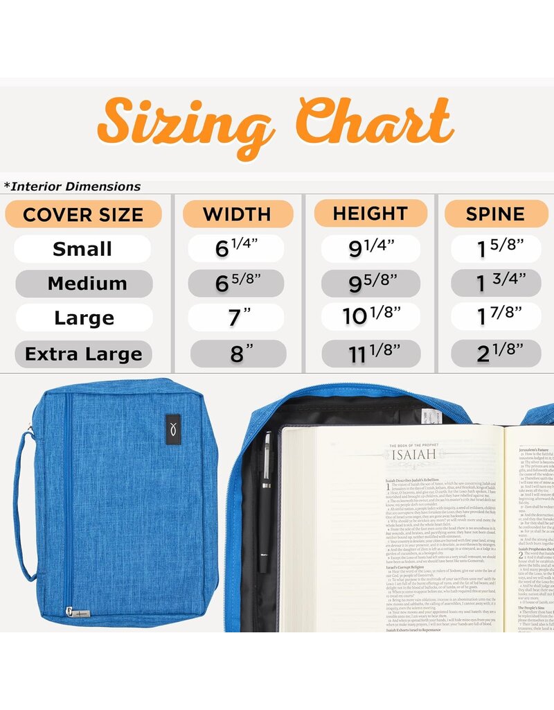 This Bible cover is available in four sizes: small, medium, large, and extra-large. Please refer to the last image in the image carousel on the left for the Bible Cover Sizing Chart before you make a selection.