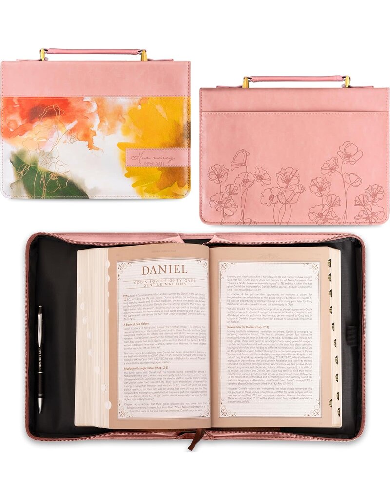 Beautifully & Thoughtfully Designed in-House: An excerpt inspired from the book of Lamentations is debossed on a small, faux leather patch on the front right side of the cover: "His mercy never fails", in a multi-font text. A heat-debossed floral pattern is featured on the back of the Bible cover for a finishing touch.